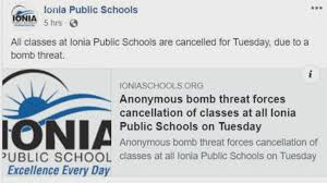 [ https://www.mlive.com/news/grand-rapids/2019/09/ionia-public-schools-to-close-tuesday-sept-3-after-bomb-threat.html ]