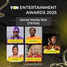 YEN Entertainment Awards (YEN‑EA), organized by the Ghanaian media conglomerate YEN.com.gh, has become the gold standard for celebrating excellence across entertainment, fashion, and digital media. The 2025 edition featured several categories ranging from “Best Music Video” to “Emerging Artist of the Year.” The “Social Media Star (TikTok)” category specifically honors creators who have showcased outstanding creativity, growth, and influence on the TikTok platform over the past year.